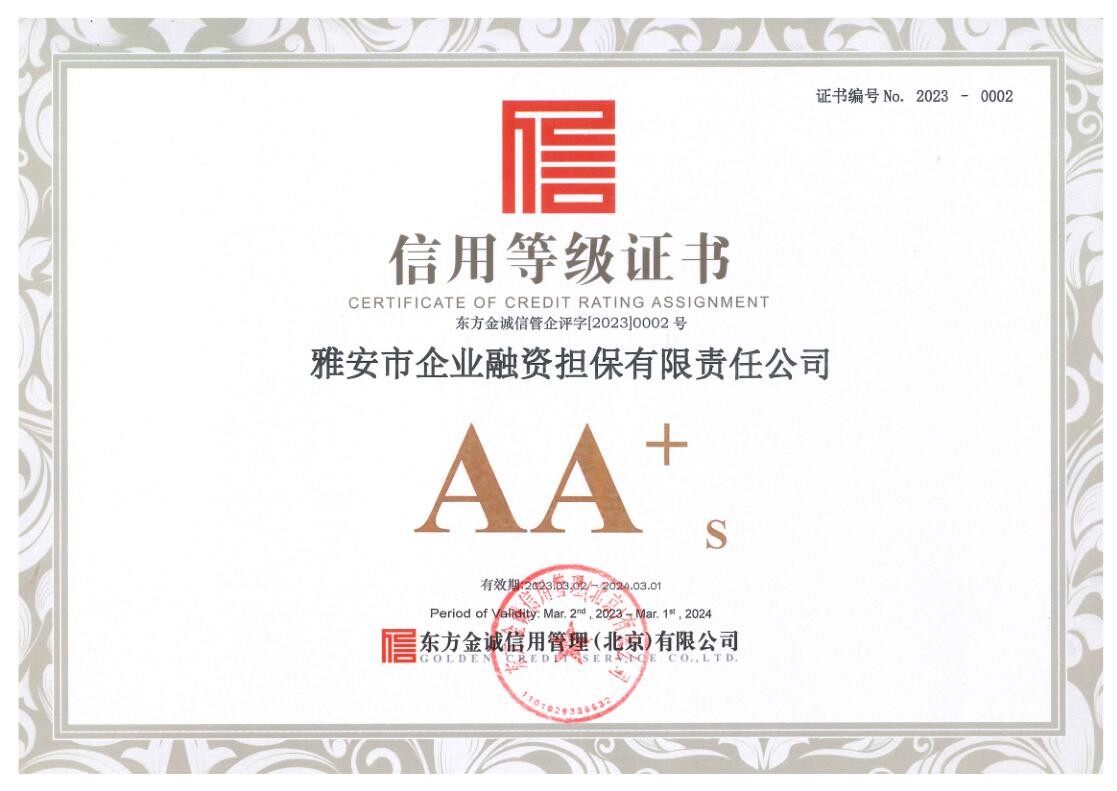3月3日,雅安市企業(yè)融資擔(dān)保有限責(zé)任公司(以下簡稱“市擔(dān)保公司”)傳來喜訊,經(jīng)東方金誠信用管理(北京)有限公司通過對市擔(dān)保公司的信用狀況進行綜合分析和評估,確定該公司信用等級為AA+。