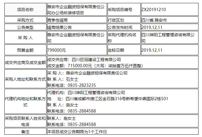 雅安市企業(yè)融資擔(dān)保有限責(zé)任公司辦公場(chǎng)所裝修項(xiàng)目競(jìng)爭(zhēng)性磋商結(jié)果公告
